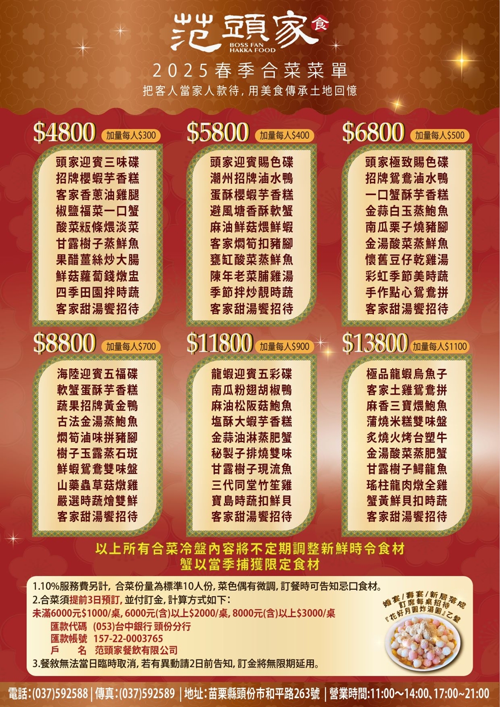 ▲這是「范頭家客家餐館」的桌菜菜單,供參考(實際販售品項與價格,以店家現場公告為主)