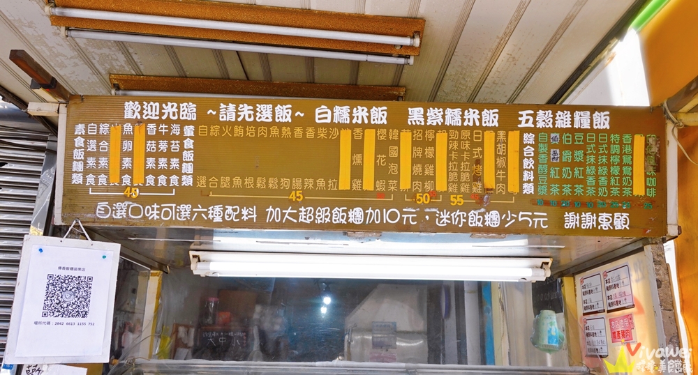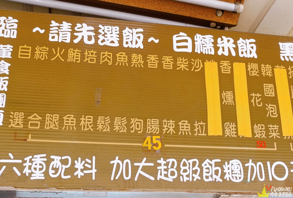 ▲經過多年後再訪發現價格有調整,若是自選口味最多可選六種配料,但價格則需要看你選了哪些配料而定!若要加大飯糰+10元,要吃小飯糰可以-5元!