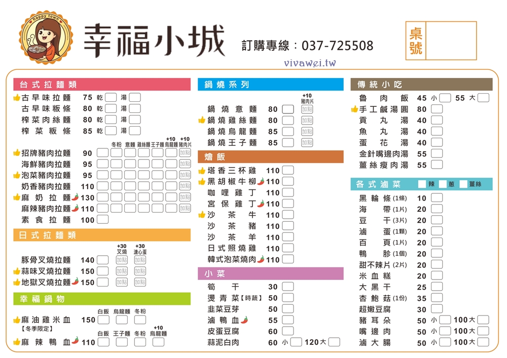 苗栗後龍美食「幸福小城」,距離後龍火車站步行約5分鐘,販售拉麵、鍋燒麵、燴飯、麻油雞、麻辣鴨血、滷味小菜等餐點~主打選用天然食材,每天採用當日新鮮蔬果熬煮湯頭,即便是小本生意,對於食材料理上也有自己的堅持!文章內有店家地址、電話、營業時間、完整菜單價目表MENU供參考。