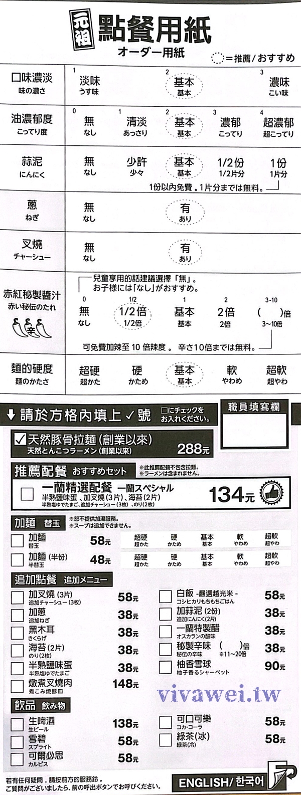 每一份拉麵都是客製化的,可以自己選擇喜歡的口味和硬度!如果吃到一半想要追加,座位旁邊都有追加單可以填寫!