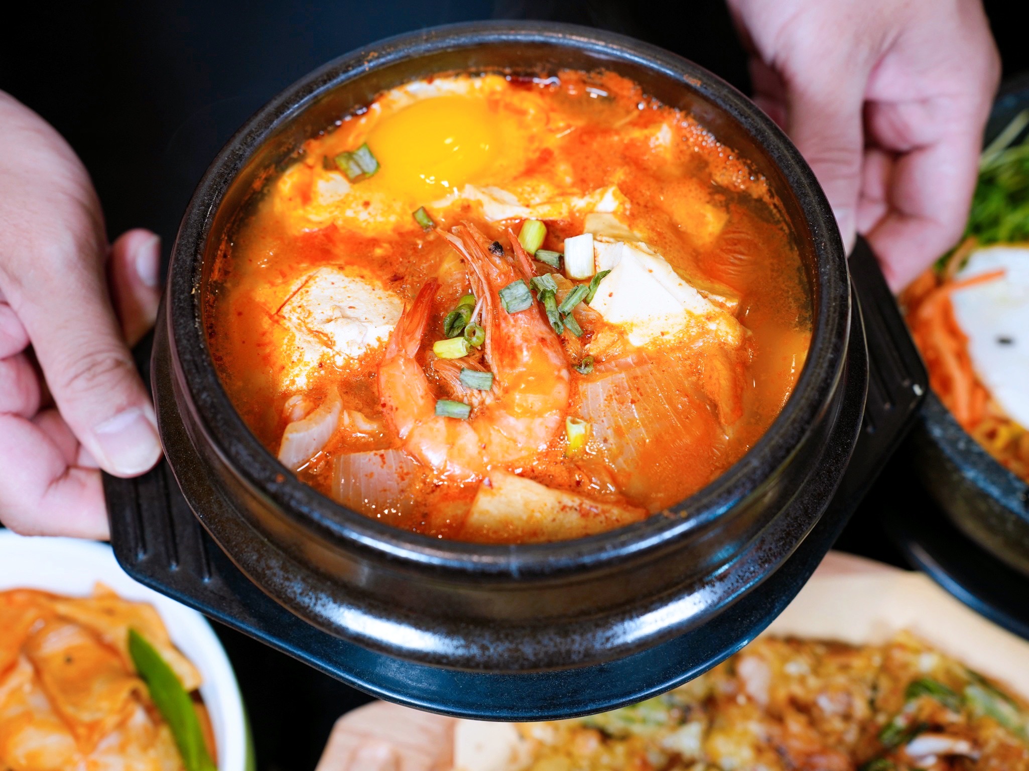 ▲韓式海鮮辣嫩豆腐鍋的湯底順口,吃起來大概是微辣的程度,湯面上浮著一顆新鮮雞蛋、嫩豆腐與海鮮食材,尤其那隻橘紅色的鮮蝦,搭配綠蔥點綴,讓人視覺與味覺都備感滿足!
