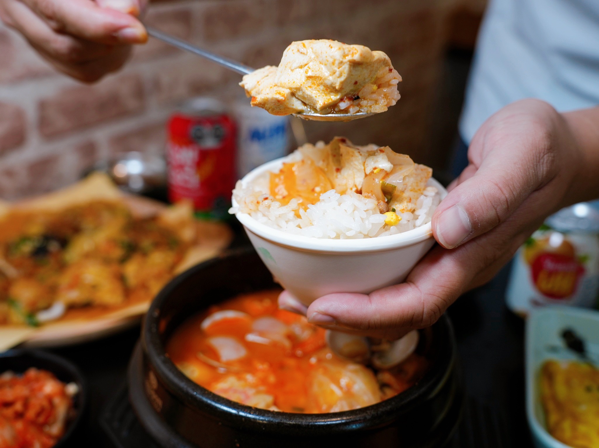 ▲湯頭喝起來是辣中帶鮮的滋味,辣味溫潤而不嗆喉,尾韻帶有蛤蜊與蝦殼熬出的鮮甜!豆腐吸飽了湯汁,滑嫩中透著濃郁的風味,搭配鍋物附的白飯一起食用,會更有飽足感唷!