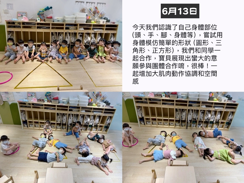 ▲今天和同學們用身體模仿簡單的形狀~大家躺在地上拼出圖形的樣子超可愛的啦!