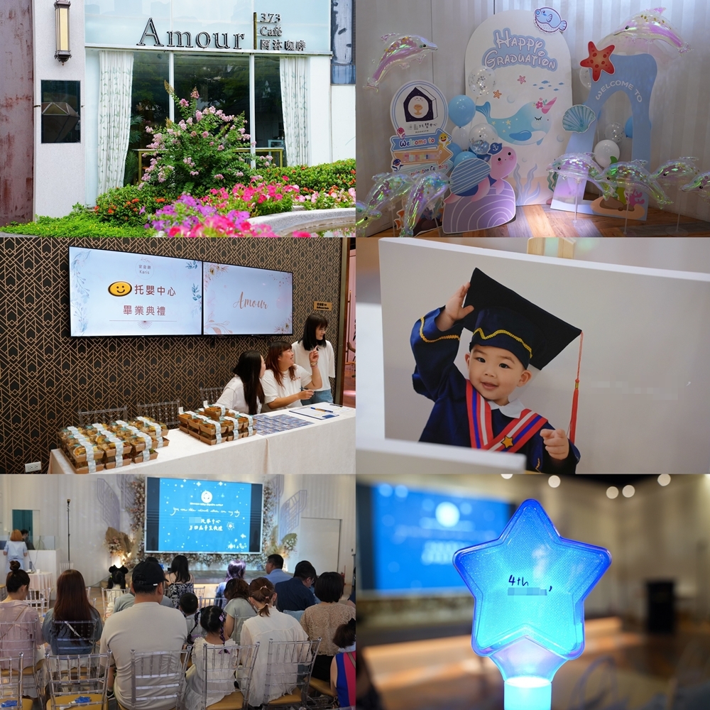 ▲今年托嬰中心的畢業典禮在「Amour阿沐」舉辦,位置是由小朋友替家長抽的,入場後座位上擺了螢光棒,場內提供了茶水和果汁,離場後還有點心可以拿!學校還請了專業的攝影團隊紀錄,真的是很用心呢!