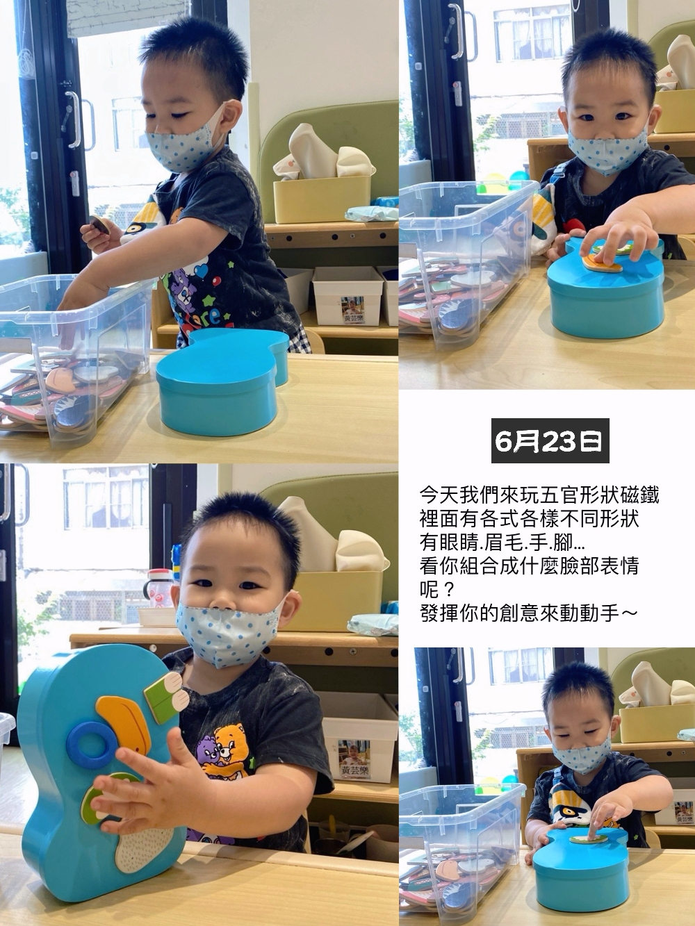 ▲這天在學校玩五官形狀的磁鐵~裡面有眼睛、眉毛、手、腳~就看小朋友們怎麼樣組合~