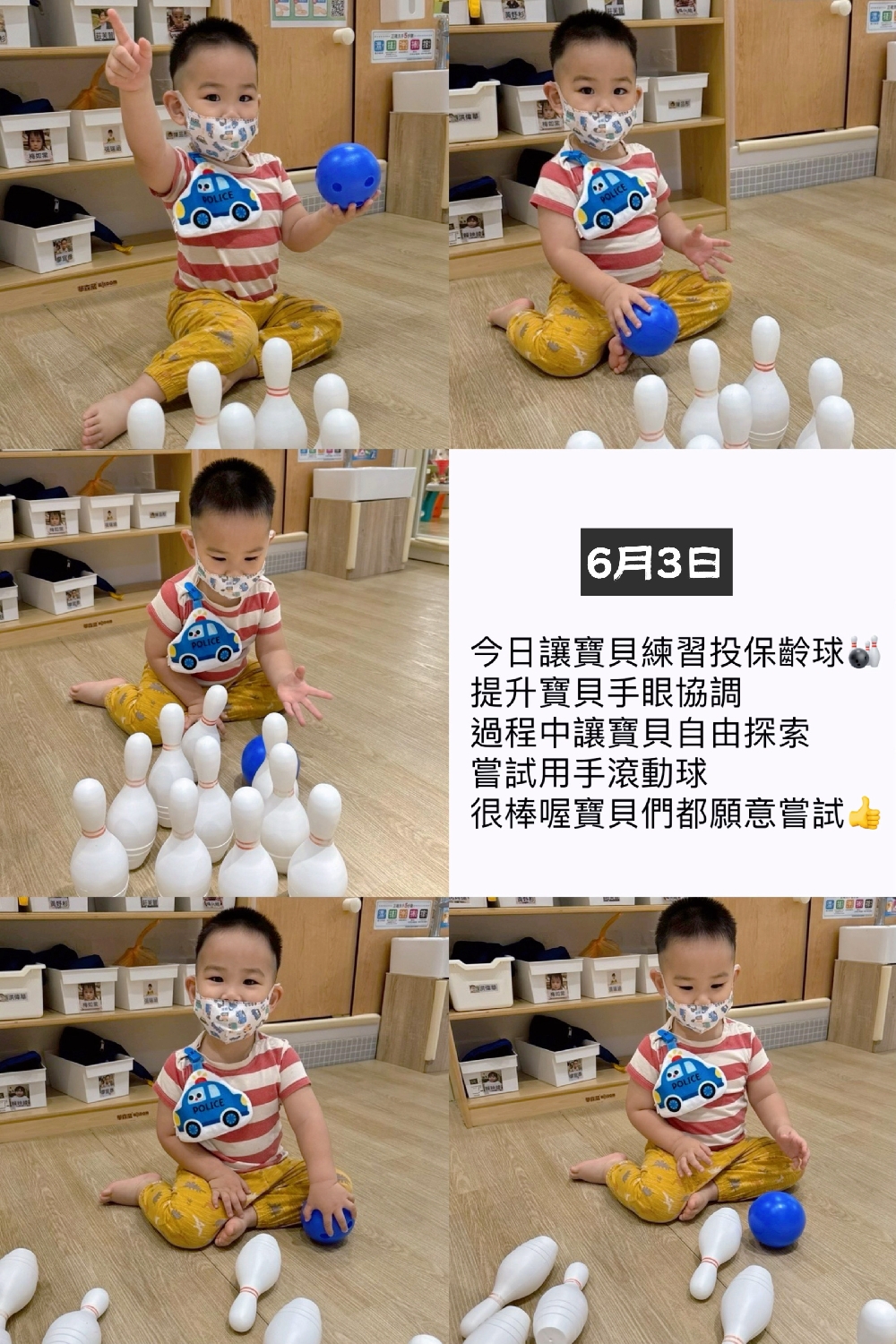 ▲今天在學校練習投保齡球,用藍色的球球把白色的保齡球都打倒,球打不倒的就用手來幫忙😂