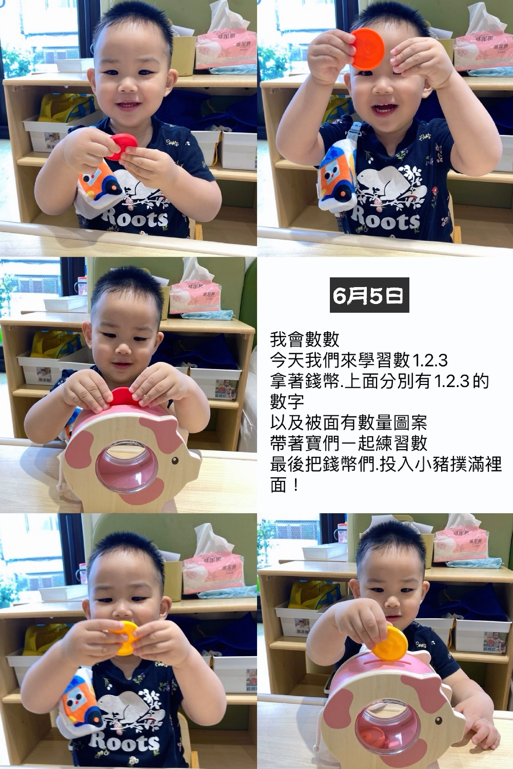 ▲今天練習數1.2.3,錢幣上面分別寫了1.2.3的數字,讓湯包可以把指定的錢幣放入小豬撲滿裡面!