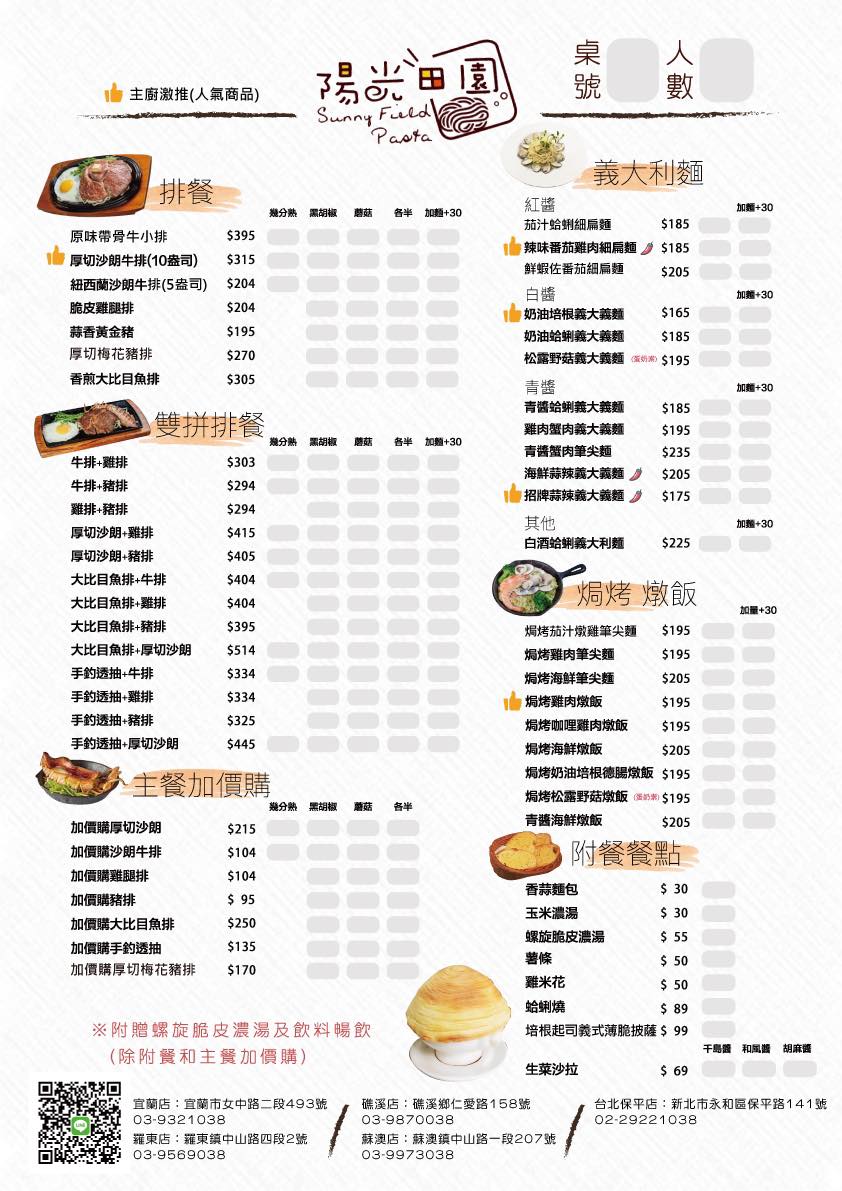 (新增2023年6月最新菜單)宜蘭礁溪美食「陽光田園」,高CP值排餐只要235元起,義大利麵210元起,點主餐均附贈螺旋酥皮濃湯和免費紅茶暢飲!壽星本人出示證件可享有當月主餐9折、當日主餐7折的優惠唷!文章內有店家地址、電話、營業時間、完整菜單價目表MENU供參考(此為Uber Eats和Food Panda合作店家)!
