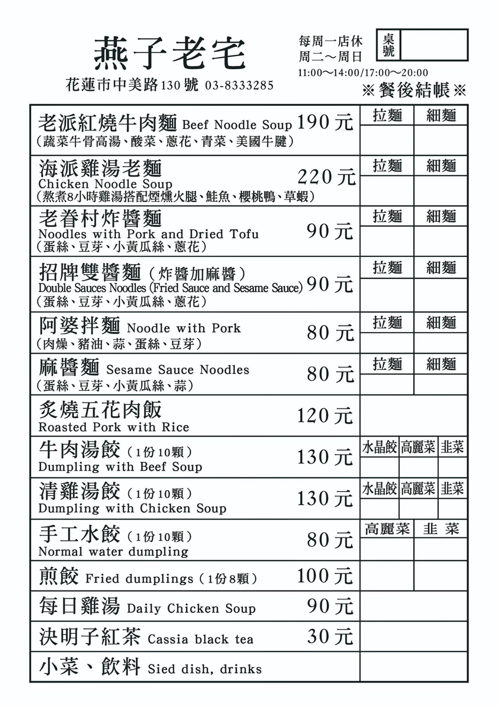 ▲這是「燕子老宅」的最新菜單,供參考(實際販售品項與價格,以店家現場公告為主)。